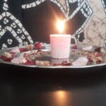 Mens du visualiser alt det, selv pleje, ned i dit lys kan du smøre det ind i duft olie, her har jeg bare visualiseret da der var duft i lyset, det var rose og kamille, der var i dette duft lys og lyset blev kalde Joy and Love. Det kan med fordel også siges højt over lyset, de ord du har riset ind i del.