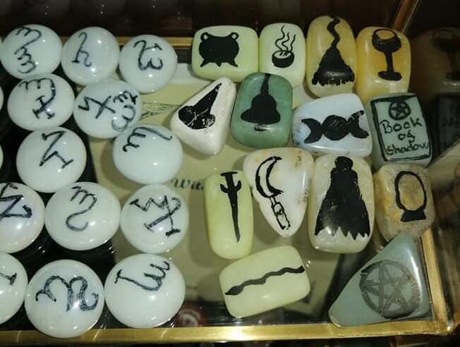 Jeg har taget billeder af både mine hjemmelavet hekse runer og af hekse runer som jeg har købt… Og som I kan se kan disse laves i mange forskellige materialer… Sten, krystaller, træ, knogler… Ja mærk blot efter inden i dig selv om, hvad der taler mest til dig, dette er nemlig også en vigtig del af magien, at bruge materiale, som vibrere med ens indre og tiltaler og kalder på en og det vil yderlig fremhæve hekse runernes kraft og magi så det arbejder endnu bedre.